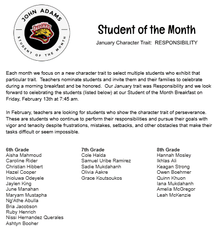 Student of the Month Breakfast: Friday, Feb. 13th at 7:45 am